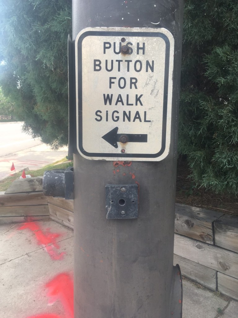 Multiple issue exist with this route. The first is at 8th Ave where the button for the crosswalk signal is missing. Based on the condition of the pole it has been damaged for a while.